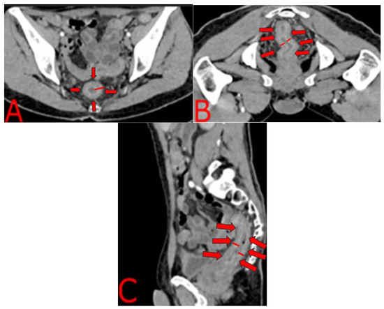 Concentric rectal wall thickening on contrast-enhanced CT. (A) Axial image at the mid-pelvic level demonstrates uniform, concentric thickening of the rectal wall, with preservation of the fat plane and no discrete mass. The wall measures up to 8 mm in thickness and shows homogeneous enhancement. (B) A higher axial slice just above the elevator ani reveals continuous involvement of the distal rectum, without perirectal fat stranding or lymphadenopathy. (C) Sagittal reformatted image illustrates the full cranio-caudal extent of rectal involvement, from the rectosigmoid junction down to the anal canal, maintaining a smooth, stratified appearance.