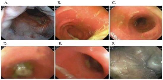 Representative colonoscopic findings. (A) Anal canal. Congested, erythematous mucosa with superficial erosions and overlying yellow-white exudate. (B) Distal transverse colon. Diffuse mucosal hyperemia with adherent fecaloid debris and mild edema. (C). Descending colon. Patchy pseudomembranous plaques on an erythematous, friable background. (D). Mid-transverse colon. Scattered superficial ulcerations with granulation tissue and thick adherent exudate. (E) Sigmoid colon. Circumferential erythema, loss of normal vascular pattern, and mucosal friability. (F) Perianal skin (anoderm). Bluish-black hematoma with adjacent mucosal edema and granularity.