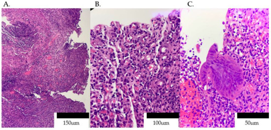 Granulation tissue with numerous capillaries permeated by dense plasma cells and occasional eosinophils. (A) Low-power (×40) view showing exuberant granulation tissue replacing normal mucosa, with numerous newly formed capillaries and a dense mononuclear infiltrate. (B) Intermediate magnification (×200) highlights small, thin-walled capillaries lined by plump endothelial cells, surrounded by a heavy infiltrate of plasma cells. (C) High-power (×400) detail of sheets of mature plasma cells admixed with occasional eosinophils, and focal epithelial regeneration without granuloma formation.