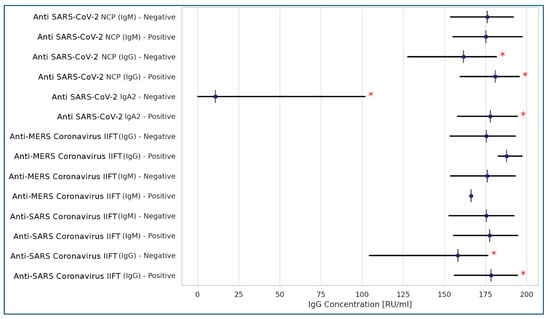 Following tests produced by Euroimmun (Luebeck, Germany) were used: Anti-SARS-CoV-2 NCP ELISA (IgG) for serum, catalogue number: EI 2606-9601-2 G, Anti-SARS-CoV-2 ELISA (IgA); cat. no.: EI 2606-9601 A, Anti-SARS-CoV-2 NCP ELISA (IgM) cat. no: EI 2606-9601-2M and Anti-SARS-CoV-2 (IgG) cat. no: EI 2606-9601 G. The quantitative Anti-SARS-CoV-2 QuantiVac ELISA (IgG) cat. no.: EI 2606-9601-10 G test was also applied and used as a comparator. The absorbance of the samples was measured immediately at 450 nm and a reference wavelength of 630 nm using the microplate reader (BioTek ELx808 and Multiskan FC Thermo Scientific, Vantaa, Finland. The data was then analyzed according to the manufacturer’s instructions. The results are presented in accordance with the following formula: Control or Patient Extinction/Calibrator Extinction = Ratio. The results were interpreted according to the manufacturer’s recommendation based on the Ratio factor. Ratio < 0.8 negative, Ratio ≥0.8 to <1.1 borderline, Ratio ≥ 1.1 positive. The following interpretation of the results was recommended for the quantitative Anti-SARS-CoV-2 QuantiVac ELISA (IgG): lower than 8 RU/mL as negative; between 8 and 11 RU/mL as borderline; and ≥11 RU/mL as positive, where RU/mL is the unit of sample concentration.