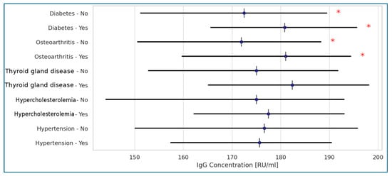 We also observed an interesting correlation between higher anti-SARS-CoV-2 antibody titers measured by QuantiVac ELISA and the presence of diabetes or degenerative joint disease in some residents. This may be explained by the general hyperactivity of the immune system in these conditions. For instance, in obesity-associated osteoarthritis, cell B activation leads to increased antibody production [32]. Additionally, COVID-19 has been shown to trigger autoimmune diseases such as psoriasis, rheumatoid arthritis, and diabetes, often accompanied by elevated levels of antinuclear antibodies [33,34].