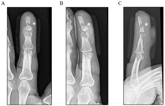 Three-view plain X-ray radiographs of the left index finger: (A) posteroanterior, (B) oblique, and (C) lateral views, labelled with * highlighting the bony erosions of the distal and middle phalanges.