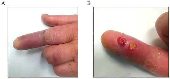 The left index finger wound 6 weeks post-injury: (A) The erythematous and dusky appearance up to the proximal interphalangeal joint. (B) The discharging wound on the volar aspect of the distal phalanx.