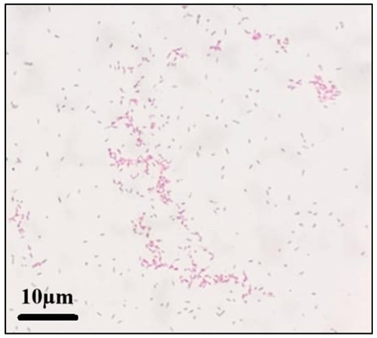 Intraoperative findings revealed the extensive necrosis of the bone and surrounding soft tissue, consistent with osteomyelitis. Bone tissue samples were collected for Gram-staining and a bacterial culture. A microscopic examination of the Gram-stained preparation revealed Gram-positive coccobacilli (Figure 4).