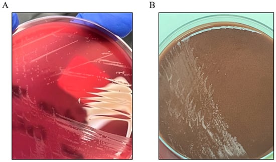 To facilitate the isolation of both fastidious and non-fastidious organisms, the intraoperative tissue samples were placed on three separate media culture plates: 1× horse blood agar (HBA) and 1× chocolate horse blood agar (CHBA) under aerobic conditions with 5% CO2 and 1× HBA under anaerobic conditions. All cultures were maintained at 37 °C. After seven days of incubation, the bacterial growth was most prominent on the aerobic plates (Figure 5). The identification was confirmed as Schaalia canis using matrix-assisted laser desorption/ionization time-of-flight mass spectrometry (MALDI-TOF MS; Bruker ® MBT, Dorevitch Pathology, Melbourne, Australia). No additional pathogenic organisms were isolated. Antibiotic susceptibility testing was not performed in this case, in line with standard practices, as Schaalia and Actinomyces species are generally susceptible to beta-lactam antibiotics [7]. However, had there been a lack of clinical improvement with the beta-lactam therapy, further antibiotic sensitivity testing would have needed to be pursued to guide targeted treatment.