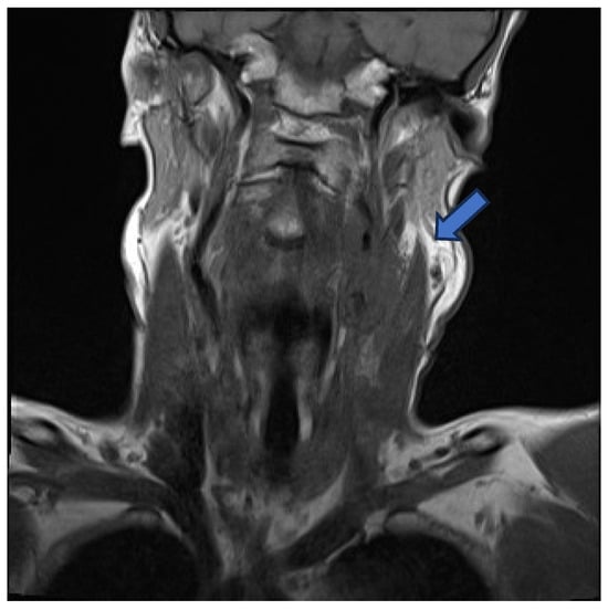 MRI—mass encasing the left common carotid, carotid bulb, and internal carotid arteries (blue arrow).