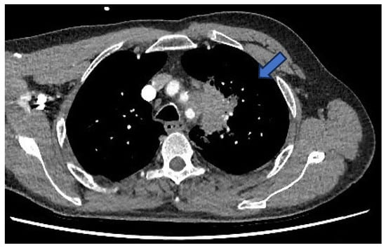 CT—left-sided lung mass (blue arrow) invading into the mediastinum, involving the aortic arch and proximal descending aorta.