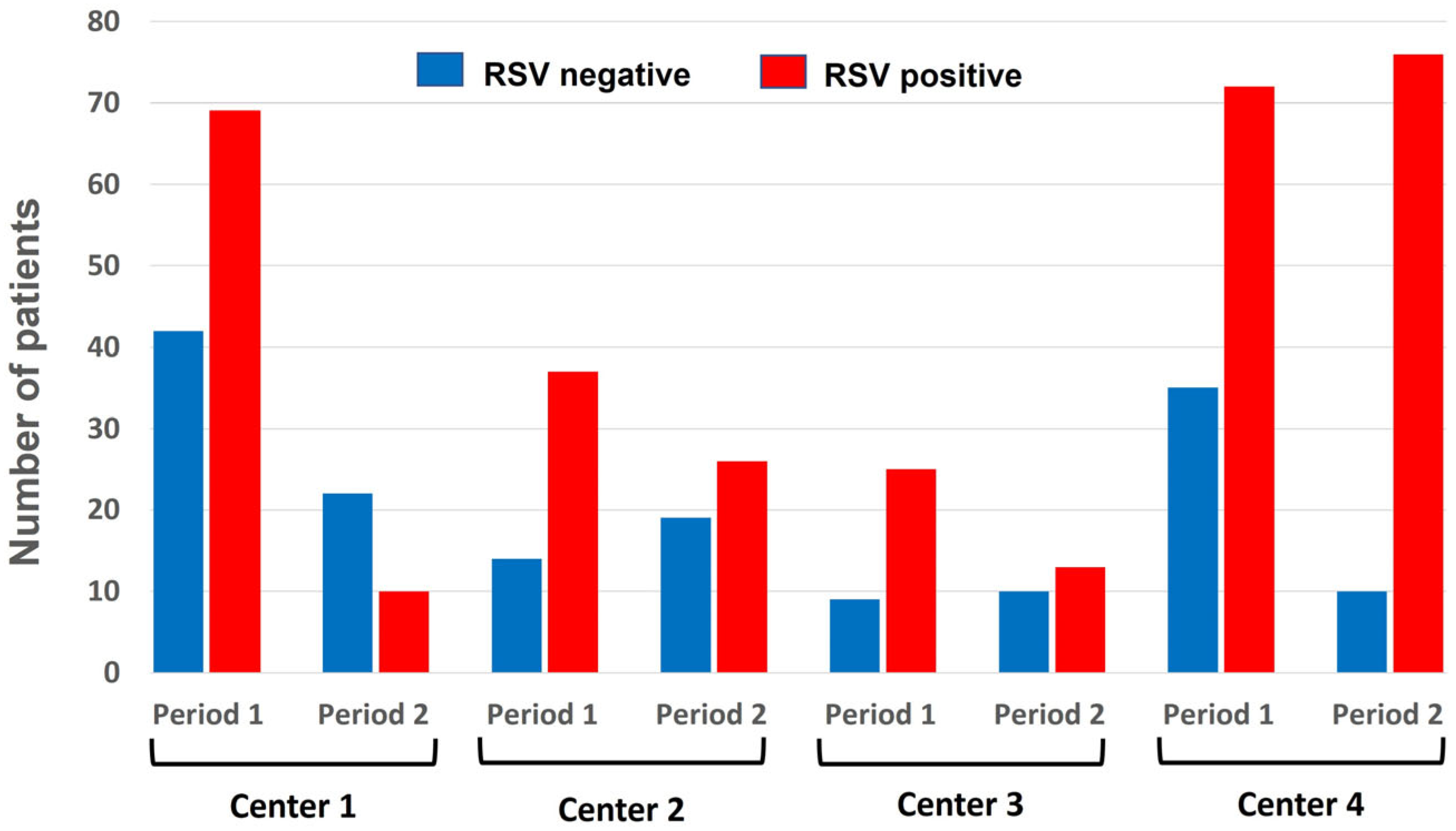 Figure 1, during the 2024–2025 season (period 2), after the introduction of nirsevimab, the number of admissions for bronchiolitis due to RSV in the four participating centers decreased significantly compared to the number observed during the previous season (period 1). The reduction was as follows: center 1 observed a reduction of 85% in admissions for RSV bronchiolitis (OR = 0.342 (95% CI [0.139, 0.844])), indicating a 66% lower odds of RSV positivity in the second period; in center 2, the reduction was 51% (OR = 0.542 (95% CI [0.206, 1.425])), corresponding to a 46% reduction in odds, but not statistically significant; in center 3, the reduction rate was 68% (OR = 0.288 (95% CI [0.087, 0.958])), reflecting a 71% decrease in odds. Otherwise, center 4 failed to achieve any reduction, since the number of observed cases increased by 9% in comparison with the 2023–2024 season.