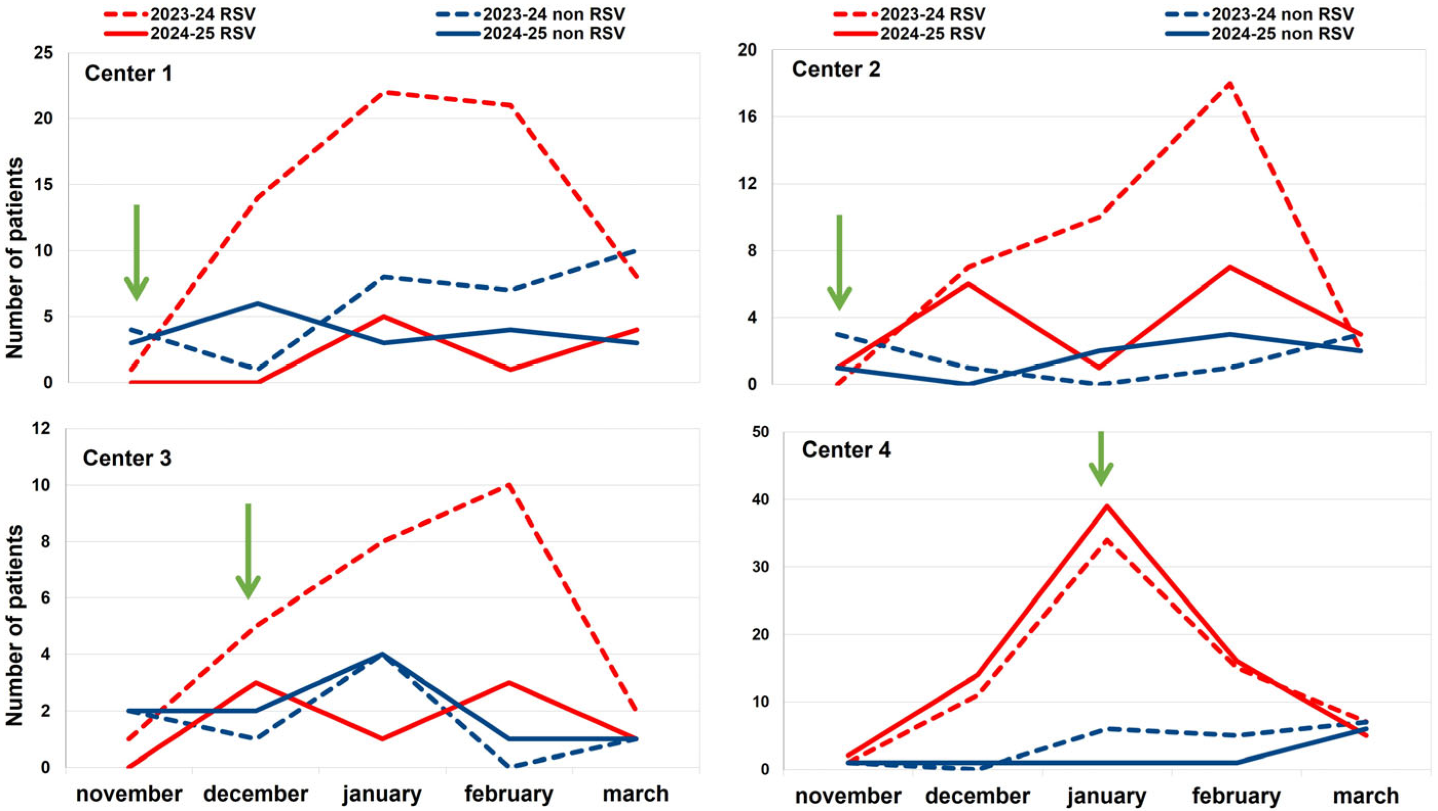 Figure 2 illustrates these data by showing the pattern of the monthly distribution of admissions for bronchiolitis across the four participating centers, which is also related to the timing of the start of the immunization program.