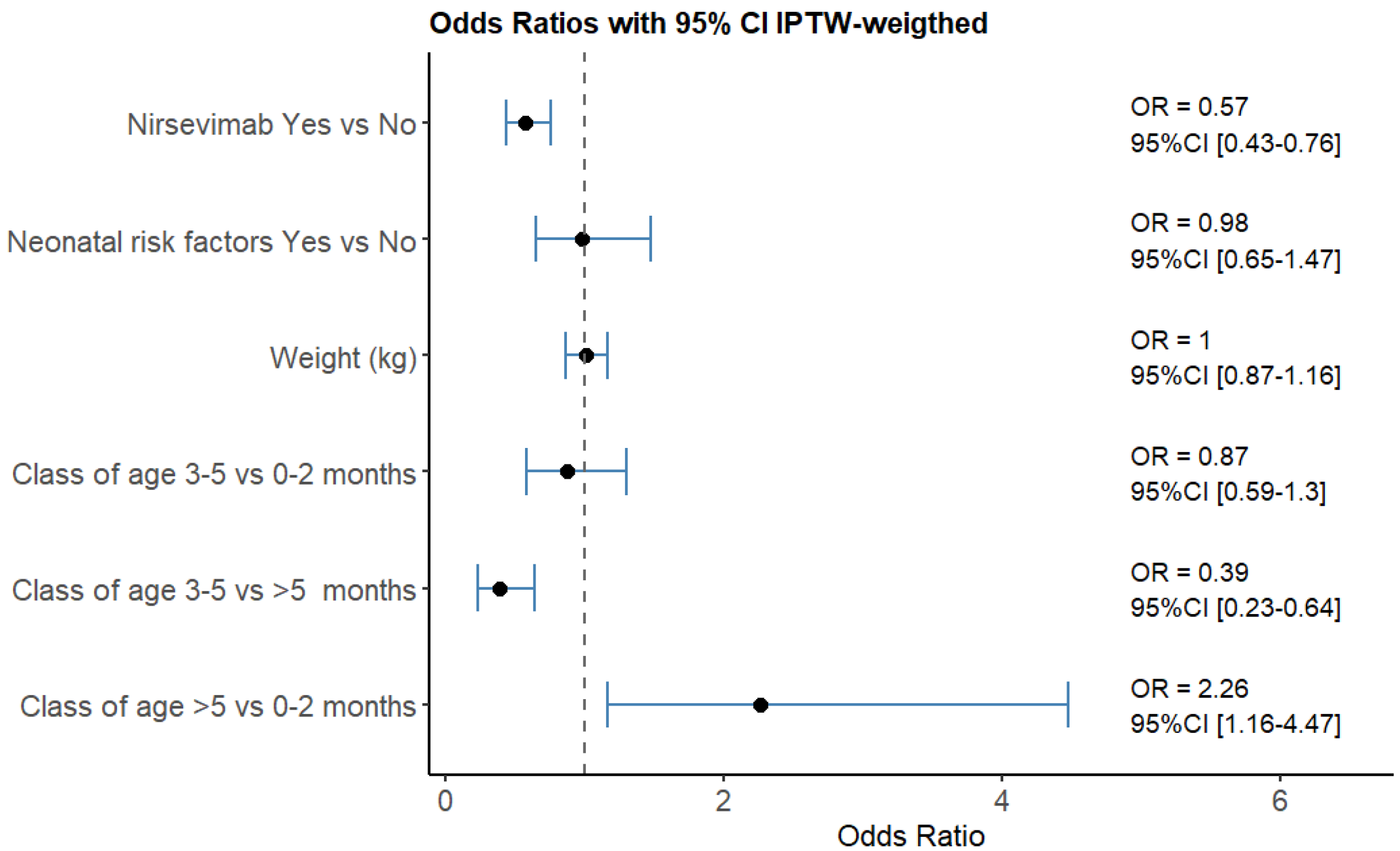 | Nirsevimab: Yes vs. No | 0.499 | [0.213–1.169] | 0.572 | [0.433–0.756] |