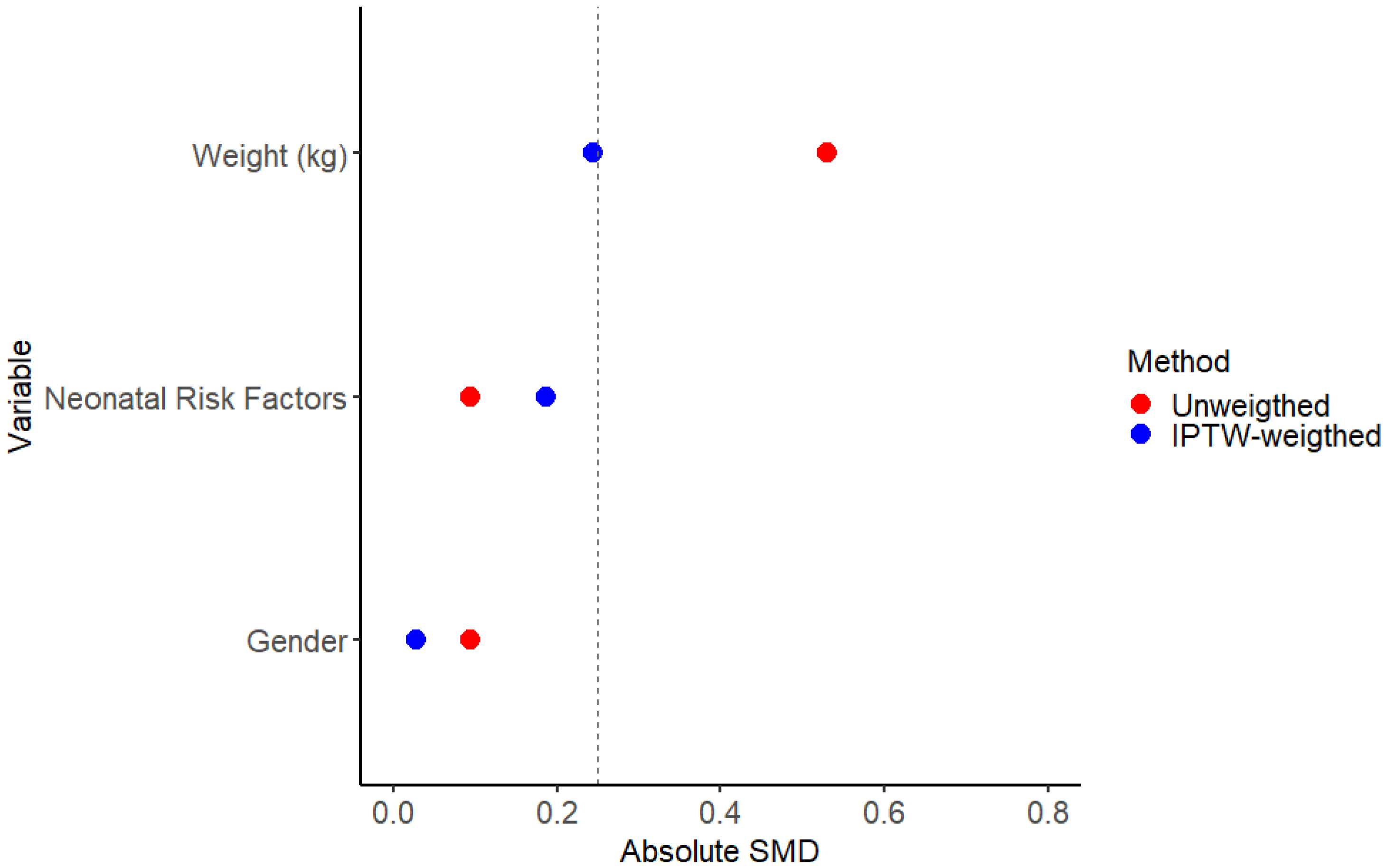 p = 0.6781). The prevalence of neonatal risk factors before IPTW (86.0% vs. 82.6%;