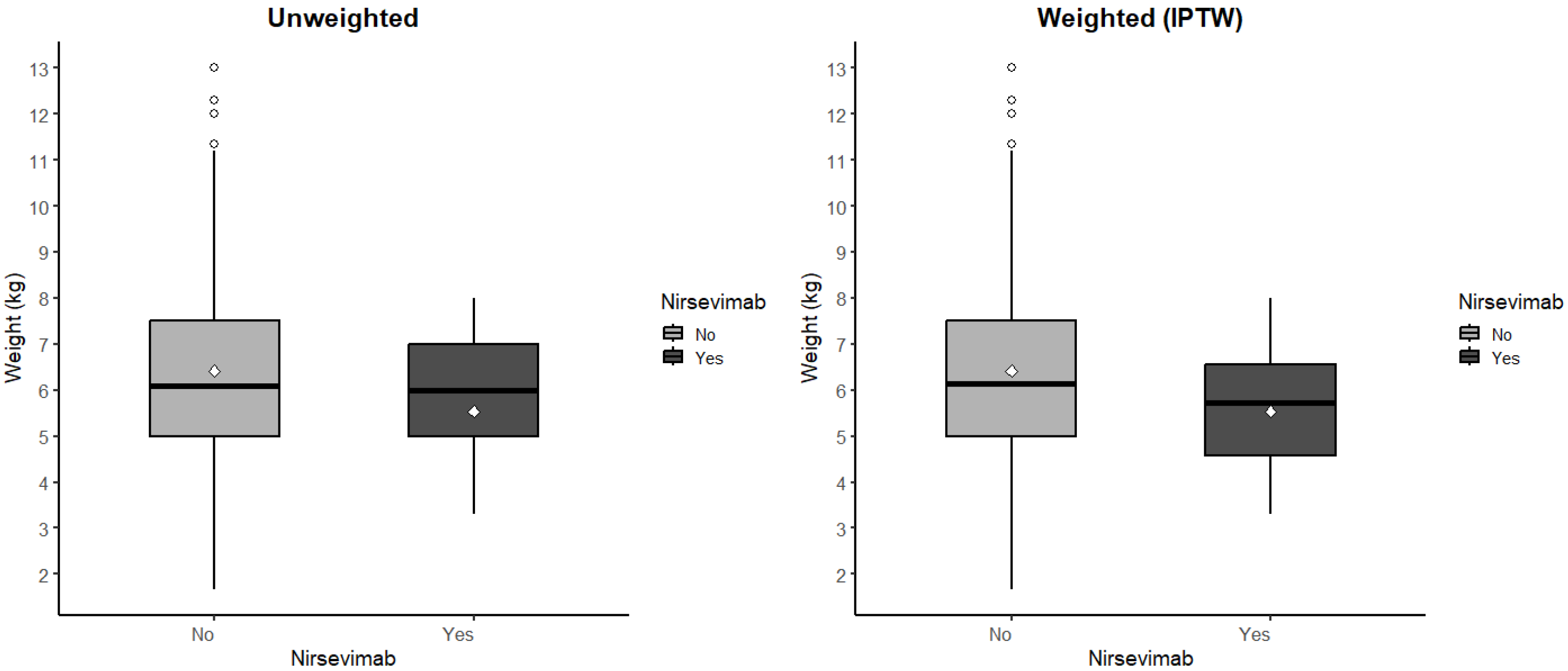 p = 0.0311), but the difference after IPTW was statistically significant. The increase in the standard deviation suggests a potential bias in the estimation, indicating greater variability among infants who received the nirsevimab immunization. In