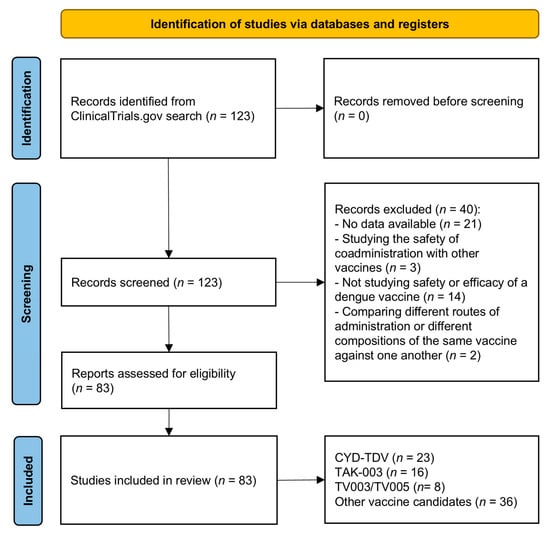 In October 2023, we conducted a query on ClinicalTrials.gov using the search term “dengue vaccines” to identify past and present vaccine candidates. All retrieved trials were evaluated for inclusion based on availability of data about the safety and efficacy of the vaccine candidate. Trials with outcomes other than safety, efficacy or immunogenicity and trials with no published data were excluded. This search was repeated during the writing of this article (latest update on 9 February 2025) to ensure the inclusion of the most recent data from ongoing studies. Data from publications related to these studies were used when available; otherwise, results posted on clinicaltrials.gov were referenced. The data were then analyzed independently by two authors (D.M. and A.B.), categorized into licensed vaccines and vaccines in late-stage development (CYD-TDV, TAK-003, TV003/TV005), vaccines candidates abandoned in early-stage development (TDEN), and vaccine candidates still undergoing phase I-II trials (DPIV, V180, TVDV), and summarized with the available details about safety, immunogenicity and efficacy (overall and subgroup-specific). The selection process is highlighted in Figure 1. This scoping review was conducted following the Preferred Reporting Items for Systematic reviews and Meta-Analyses extension for Scoping Reviews (PRISMA-ScR) Checklist (available as Supplementary Material).