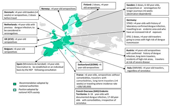 WHO recommends vaccination with TAK-003 for children aged 6–16 years in endemic areas and supports the introduction of TAK-003 into routine immunization programs in these settings. However, due to lack of data demonstrating VE against DENV-3 and DENV-4 in seronegative individuals, WHO does not recommend the programmatic use of TAK-003 vaccine where dengue transmission is low or moderate. As regarding vaccination in the adult population, since TAK-003 efficacy was mainly studied in children and adolescents, WHO supports vaccination in adult subjects with comorbidities living in dengue-endemic countries, with an upper age limit of 60 years [90]. Indeed, evaluation of vaccine efficacy is challenging in the adult population, due to high seroprevalences in this population group. However, available data suggest that immunogenicity of TAK-003 in adults is comparable to the younger population, suggesting that comparable efficacy could be expected in older groups. The vaccine is approved for subjects ≥ 4 years by EMA, but age indications vary between different countries, mainly due to weak scientific evidence. According to May 2024 WHO’s position paper, travelers with previous history of dengue infection could also benefit from vaccination to prevent a second infection when traveling again to an endemic country. Frequent travelers, long-term travelers, migrants, and long-term expatriates, due to higher probability of being seropositive, could also benefit from vaccination. However, they should be informed that the highest benefit of vaccination is when epidemics due to DENV-2 or DENV-1 are ongoing at the destination, whereas the vaccine may not protect against DENV-3 and DENV-4 if they are seronegative, with a potential risk of severe dengue in case of exposition to DENV-3 and DENV-4. In certain cases, pre-vaccination serological screening could help balancing risks and benefits of TAK-003 vaccination in travelers [89]. As regarding the field of travel medicine, in the wake of the WHO recommendations, a number of scientific societies and national authorities have issued heterogeneous country-specific indications [92,93,94,95,96,97,98,99,100,101,102,103,104,105,106,107,108]. A summary of currently available recommendations regarding dengue vaccine indications for travelers issued by national authorities and scientific societies in the European context is represented in Figure 2. Due to a lack of published data, each position regarding vaccine administration to different population groups and in different epidemiological settings should be taken with caution until stronger evidence is available on this field. As regards FDA approval for TAK-003, the pharmaceutical company withdrew the application for its approval in the United States in July 2023 due to lack of data required by the FDA for the vaccine commercialization [109]. WHO, FDA and EMA recommendations on CYD-TDV and TAK-003 vaccines are summarized in Table 3.