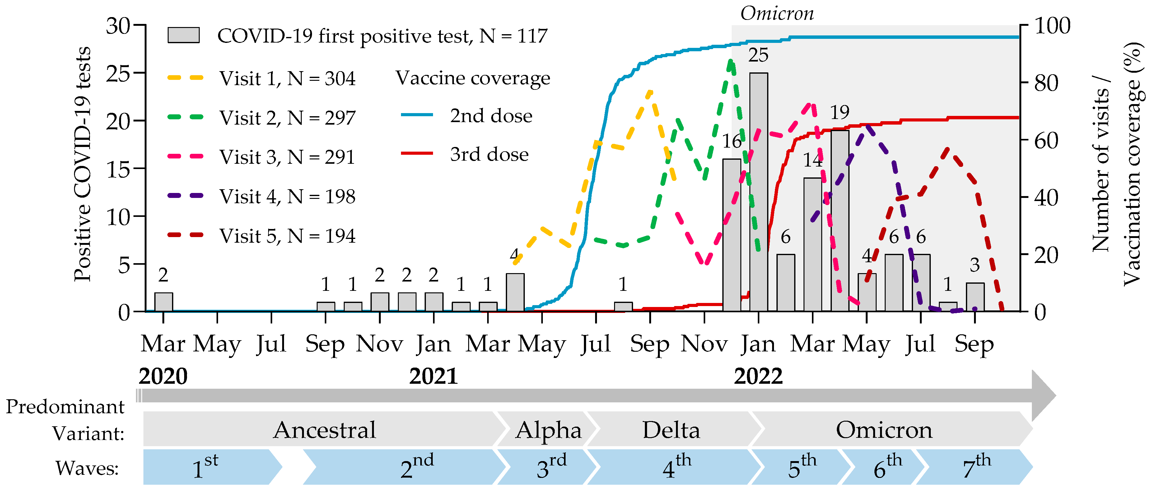 - Robinson, L.; Feting, A.; Isozaki, I.; Seyfert-Morgolis, V.; Jay, M.; Kim, E.; Cairns, C. Time-varying effects of COVID-19 vaccination on symptomatic and asymptomatic infections in a prospective university cohort in the USA. BMJ Open 2025, 15, e084408. [Google Scholar] [CrossRef] [PubMed]