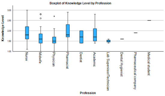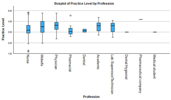 HPV-related clinical practice scores varied significantly across professional groups (Figure 3). Academics (median 4.3, IQR 4.0–4.6), physicians (median 4.5, IQR 4.1–4.8), and midwives (median 4.2, IQR 3.9–4.5) reported the highest levels of clinical engagement, with median scores above 4.2. Pharmacists (median 3.7, IQR 3.3–4.0) also showed relatively high scores, but with no observed variability, suggesting adherence to standardized protocols. Conversely, medical students (median 3.8, IQR 3.5–4.1) showed lower and less variable practice scores, likely reflecting limited clinical responsibilities. Data for laboratory technicians and dental hygienists are not provided in the table. Nurses (median 3.9, IQR 3.5–4.2) exhibited the widest range of practice scores.