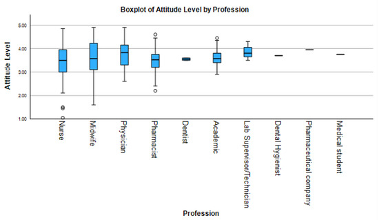 Attitudes toward HPV vaccination were generally positive across all professional groups (Figure 2), though significant variation existed. Medical students (median 4.5, IQR 4.3–4.8) and pharmaceutical professionals (median 3.7, IQR 3.3–4.0) reported the highest median attitude scores, with narrow interquartile ranges suggesting strong consensus. In contrast, nurses (median 3.8, IQR 3.4–4.1) and pharmacists (median 3.7, IQR 3.3–4.0) exhibited more variable responses, with lower outliers suggesting divergent perceptions. Physicians (median 4.2, IQR 3.8–4.5) and midwives (median 3.9, IQR 3.6–4.3) also displayed broader score distributions.