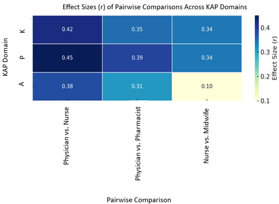 The results of descriptive analysis, inferential statistics, and post hoc comparisons are summarized in Table 2. Kruskal–Wallis tests confirmed statistically significant differences across professions in all KAP domains: knowledge (H = 28.7, p < 0.001, ε2 = 0.18), attitudes (H = 12.4, p = 0.015, ε2 = 0.08), and practices (H = 34.2, p < 0.001, ε2 = 0.21). Post hoc Dunn’s tests revealed that physicians scored significantly higher in knowledge compared to nurses (p < 0.001, r = 0.42) and pharmacists (P = 0.018, r = 0.35); in attitudes compared to pharmacists (p = 0.018); and in practice compared to both nurses (p < 0.001, r = 0.45) and pharmacists (p = 0.031, r = 0.33). Midwives outperformed nurses in practice (p = 0.002, r = 0.37).