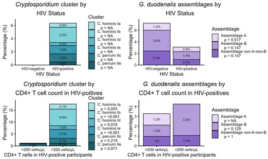 Prevalence of Cryptosporidium spp. sub-families, as well as G. duodenalis and assemblages A and B, according to the HIV status and stratified by CD4+ T-lymphocyte count. The letter p describes the significance level.