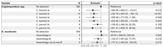 A multivariable linear regression model was employed to examine associations between Cryptosporidium spp. sub-families and G. duodenalis assemblages and CD4+ T cell counts among HIV-positive participants (Figure 2). Using individuals without detectable Cryptosporidium spp. or G. duodenalis as reference groups, the model demonstrated that infection with several Cryptosporidium spp. sub-families was significantly associated with lower CD4+ T cell counts. Specifically, the presence of C. hominis sub-families Ia, Ib, Id, and Ie corresponded to reductions in CD4+ T cell counts ranging from approximately 333 to 384 cells/µL compared to the reference group (all p < 0.05). C. parvum sub-families IIc and IIe were associated with non-significant reductions. None of the G. duodenalis assemblages showed a significant association with CD4+ T cell counts in this model.
