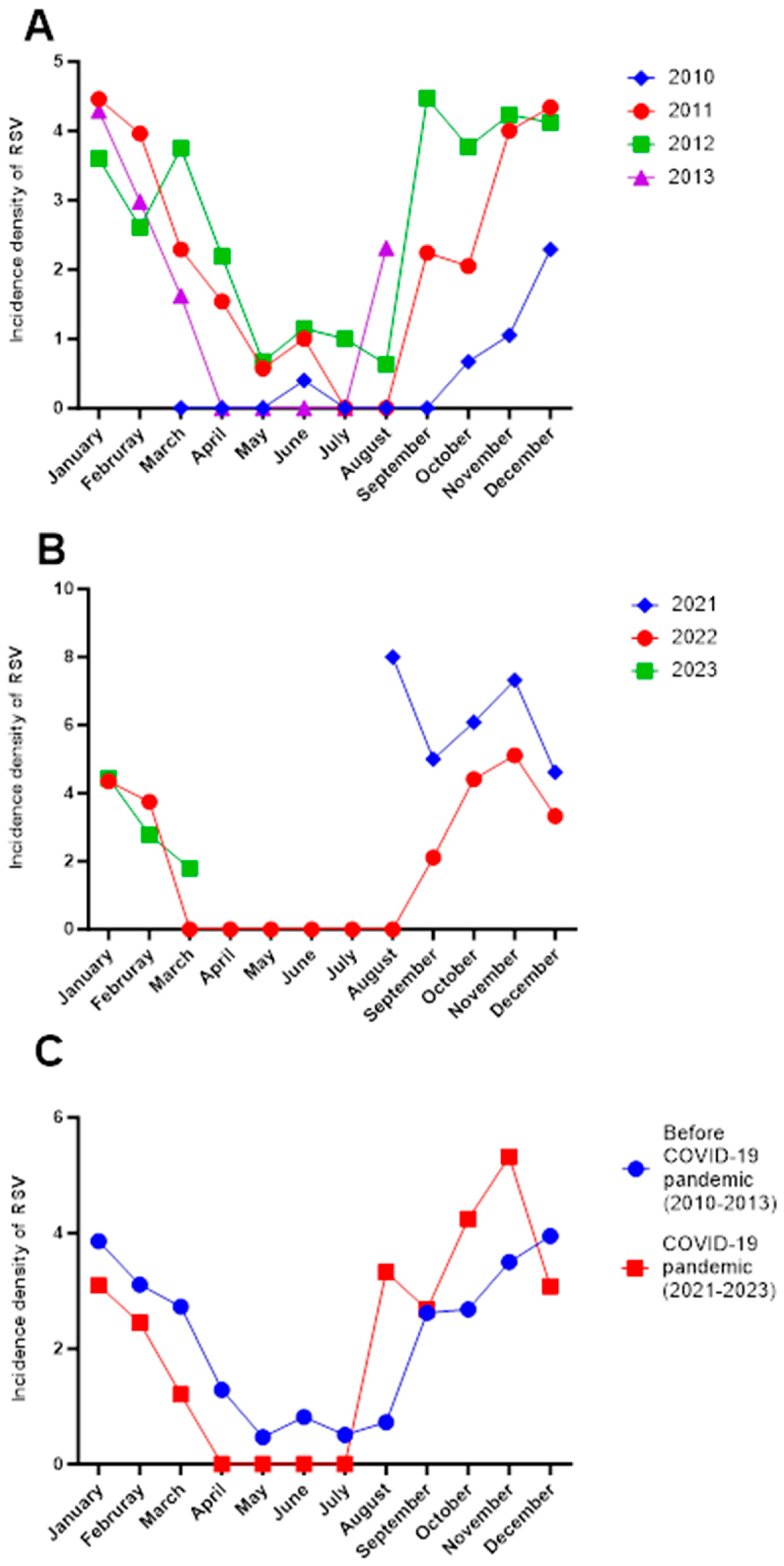 9]. The incidence density of RSV was defined as the number of new RSV-positive pneumonia cases per 10 new pneumonia admissions per month, standardized by the number of children at risk during each observation period.