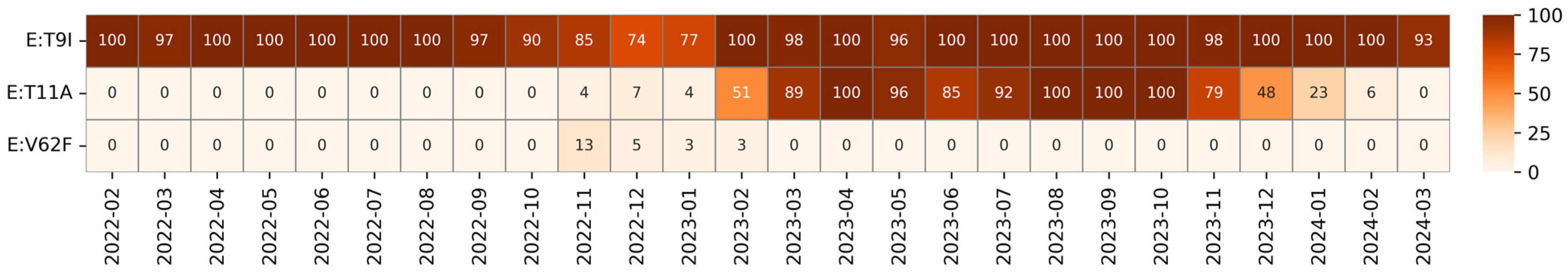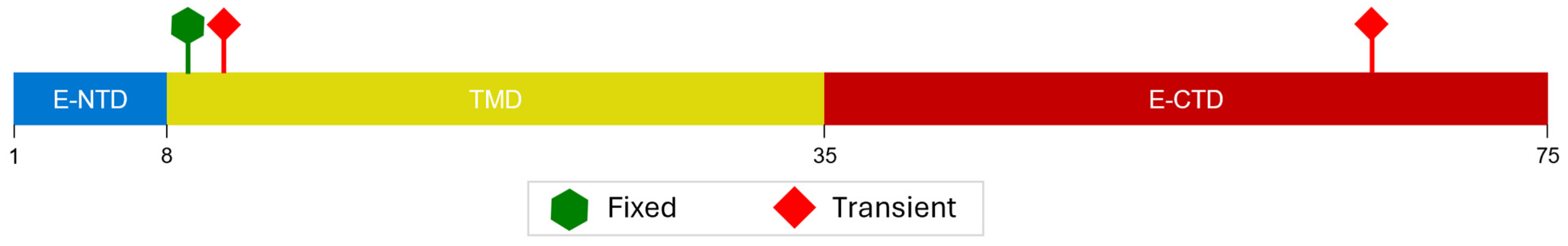 - Wang, Y.; Pan, X.; Ji, H.; Zuo, X.; Xiao, G.-F.; Li, J.; Zhang, L.-K.; Xia, B.; Gao, Z. Impact of SARS-CoV-2 Envelope Protein Mutations on the Pathogenicity of Omicron XBB. Cell Discov. 2023, 9, 80. [Google Scholar] [CrossRef] [PubMed]
