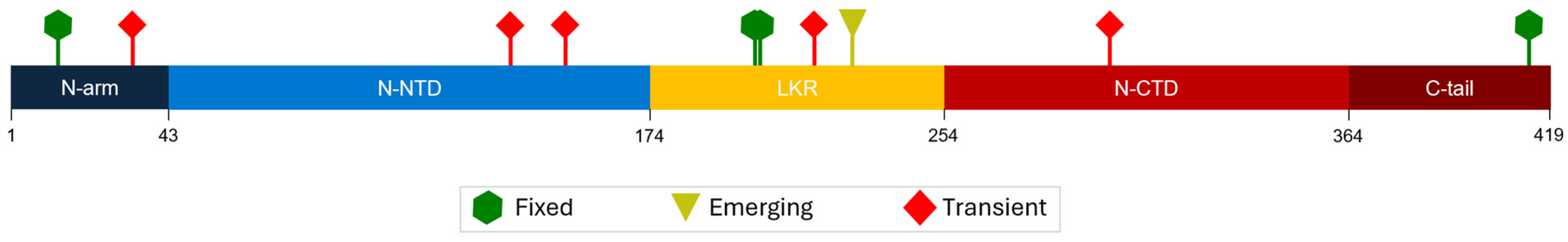 - Muradyan, N.; Arakelov, V.; Sargsyan, A.; Paronyan, A.; Arakelov, G.; Nazaryan, K. Impact of Mutations on the Stability of SARS-CoV-2 Nucleocapsid Protein Structure. Sci. Rep. 2024, 14, 5870. [Google Scholar] [CrossRef] [PubMed]