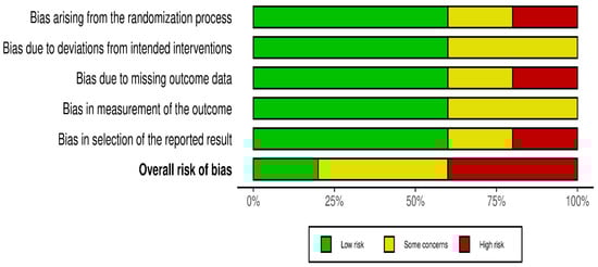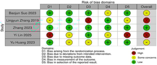Risk of bias was assessed independently using the Cochrane Risk of Bias 2.0 tool. Quality assessment and risk of bias were independently assessed using the Cochrane Risk of Bias Tool 2.0 on all included RCTs. The assessment examines five key domains where bias might be introduced. These domains include bias arising from the randomization process, bias due to deviations from intended interventions, bias due to mixing outcome data, bias in the measurement of outcome data, and bias in the selection of reported results. Each domain was carefully evaluated and rated as having either a low risk of bias, some concerns, or a high risk of bias. Based on these individual assessments, we then assigned an overall risk of bias judgment for each RCT to guide the interpretation of study reliability. The quality assessment was performed by two independent investigators, and the results were matched. Any disagreements were resolved through discussions. A summary is shown in Figure 2 and Figure 3.
