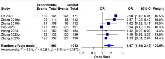 In the per-protocol (PP) analysis, all seven interventions were included, and the pooled OR was 1.67 (95% CI: 1.14–2.45), indicating a statistically significant improvement in eradication rates with MBQT over standard therapy. The low heterogeneity (I2 = 5.2%) suggests that the outcome is reproducible across different studies. This is depicted in Figure 5.