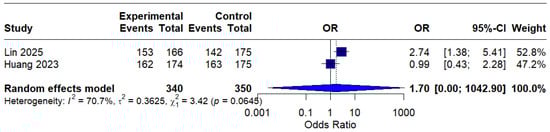 Based on only two studies, the modified intention-to-treat (mITT) analysis showed an OR of 1.70 (95% CI: 0.00–1042.90) of o, indicating a possible benefit of MBQT. However, the extremely wide confidence interval and high heterogeneity (I2 = 70.7%) rendered the result statistically insignificant and difficult to interpret clinically. This is presented in (Figure 6).