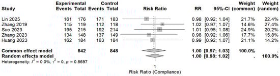 Five randomized controlled trials reported treatment compliance and were included in the pooled analysis. Overall compliance was high in both the MBQT and comparator groups. The pooled analysis revealed no significant difference in compliance rates between MBQT and standard BQT (RR ≈ 1.00, 95% CI (0.98–1.02)), with low heterogeneity (I2 ≈ 0%). This is depicted in (Figure 7). These findings also indicate that MBQT does not adversely affect the treatment adherence.