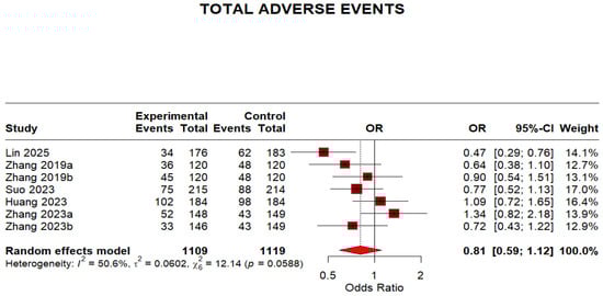 Regarding safety outcomes, the overall adverse events were not significantly different because the 95% CI crosses 1, despite a point estimate < 1 (OR 0.81, 95% CI 0.59–1.12). The moderate heterogeneity (I2 = 50.6%) indicates some variation in adverse event reporting across studies. This is shown in (Figure 8).