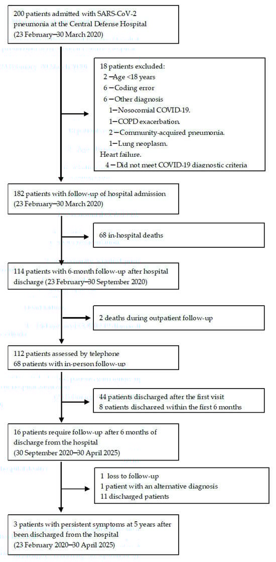 Clinical data from the hospitalization period and from a specific post-COVID-19 follow-up clinic created for these patients at the Central Defense Hospital were collected. The first assessment was conducted by telephone, during which the need for an in-person evaluation was determined using a structured checklist (Supplementary File S1). Patients who reported persistent symptoms during the telephone assessment or who presented radiological abnormalities on their last chest X-ray prior to discharge were reevaluated on an outpatient basis with clinical, laboratory, and radiological follow-up, according to a standardized protocol. Only symptoms that the attending physician attributed to PCC and recorded in the electronic medical record were considered. Patients could continue follow-up in this clinic or be referred to other specialists if necessary. To evaluate the symptoms attributed to long COVID during the long-term follow-up, including the 5-year assessment, the symptoms documented by specialists in the specific post-COVID-19 clinic at the Central Defense Hospital were considered. These diagnoses were included in the medical reports as part of the clinical assessment and were verified to meet the WHO criteria for PCC, which requires that symptoms appear within three months of the acute infection, persist for at least two months, and cannot be explained by alternative diagnoses, as mentioned in the Introduction.