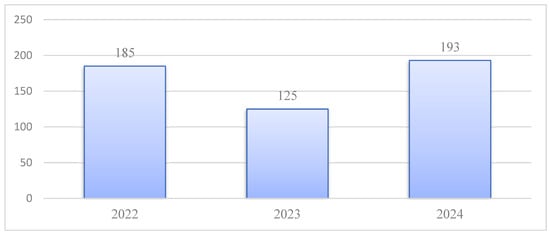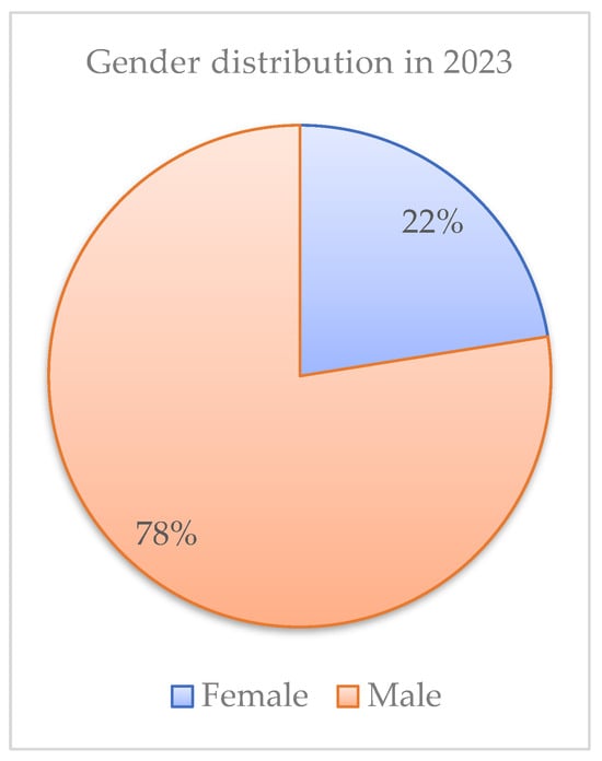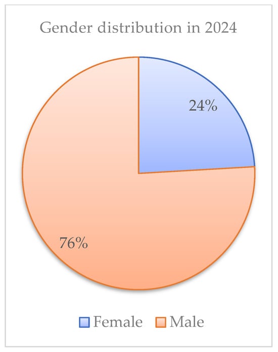 Regarding the gender distribution of new HIV/AIDS cases registered in Romania, in 2023, there was a clear predominance of male patients, representing 77.51% (n = 555) of cases, while women represented only 22.49% (n = 161) (Figure 1). This trend persisted in 2024, when 75.93% (n = 615) of total registered new cases (810) were men and only 24.07% (n = 195) were women (Figure 2).