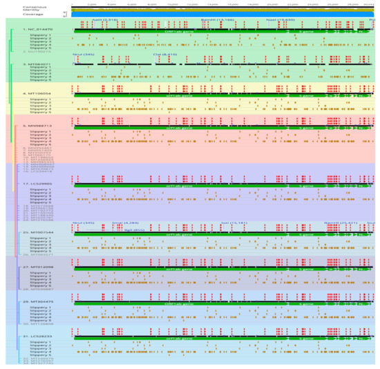 Geneious annotations and tracks: (details and locations of all of these are found in Additional Files attached) gene annotations and names (green color bars) were set to place on the sequence lines. 3′UTR, 5′ UTR, and Stem loops were shown alignments.