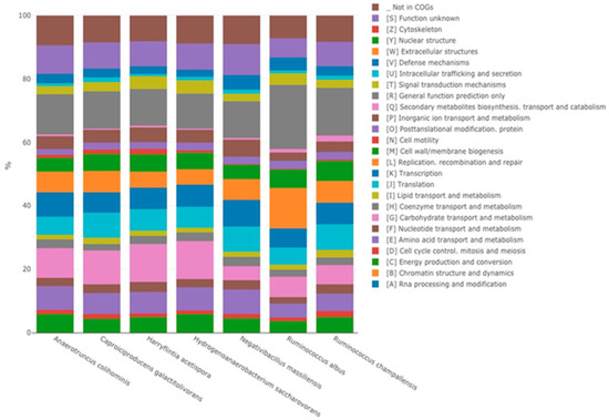 Distribution of functional classes of the predicted genes according to the clusters of orthologous groups of proteins.