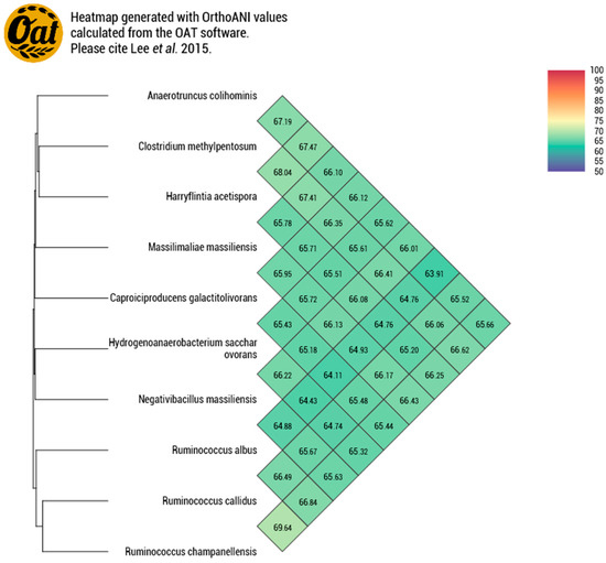 Strain P3213 had a smaller draft genome sequence than those of Harryflintia acetispora, Ruminococcus callidus, Hydrogenoanaerobacterium saccharovorans, Clostridium methylpentosum, Anaerotruncus colihominis, and Ruminococcus albus (2.930, 3.1, 3.180, 3.48, 3.720, and 3.85 MB, respectively), but larger than those of Massiliimalia massiliensis, Caproiciproducens galactitovorans, and Ruminococcus champanellensis (2.84, 2.58 and 2.570 MB respectively) (Table 3). The G + C content of strain P3213 is smaller than those of Harryflintia acetispora, Anaerotruncus colohominis, Ruminococcus champanellensis, Clostridium methylpentosum, Ruminococcus callidus, Caproiciproducens galactitovorans and Massiliimalia massiliensis, (60%, 54.2%, 53.3%, 50.7%, 49%, 45.4% 48.1%, and 47.2%, respectively), but larger than those of Hydrogenoanaerobacterium saccharovorans and Ruminococcus albus (42.7% and 45.2% respectively). The repartition between the COG categories was similar for all of the compared genomes, except for the fewer carbohydrate transport and metabolism-related proteins for strain P3213 (Figure 6, Table 4). The degree of genomic similarity of strain P3213 to its closely related species with an available genome (Table 3, Table S1) was estimated using the OrthoANI software [33]. The highest OrthoANI value was observed between Ruminococcus champanellensis and Ruminococcus callidus (69.64%), while the lowest value was 63.91%, observed between Anaerotruncus colihominis and Ruminococcus albus. The genome of strain P3213 exhibited the highest OrthoANI value, 66.41%, with Massiliimalia massiliensis (Figure 7). The degree of genomic similarity of strain P3213 with closely-related species was also calculated using dDDH. The values among the compared genomes (Table 5) ranged from 17.5% between Acetanaerobacterium elongatum and Caproiciproducens galactitolivorans, to 35.9% between Anaerotruncus colihominis and Ruminococcus champanellensis. For strain P3213, the highest value observed was 35.6%, with Harryflintia acetispora, while the lowest was 24%, with Acetanaerobacterium elongatum. Moreover, the TYGS server clearly highlights strain P3213 as a distinct and novel genus within the Ruminococcaceae family (Figure S1).