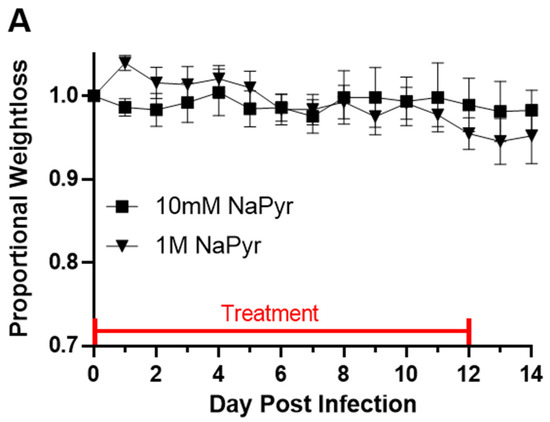 Mice were anesthetized on Day 0 via intraperitoneal injection of 80 mg/kg of Ketamine and 8 mg/kg of Xylazine. Mice were then infected intranasally with approximately 250 PFU of influenza A/PR/8/34 H1N1, diluted in 30 μL of phosphate buffered saline (PBS). Mice used for subcutaneous (Sub-Q) injections of NaPyr were injected with 110 mg/kg of body weight daily, divided into two doses, morning and evening. Mice that were treated with nebulized NaPyr were treated with Emphycorp’s clinical grade N115 (20 mM of NaPyr), or with 10 mM of NaPyr (Fisher Bioreagents, Pittsburgh, PA, USA, BP356-100) diluted in PBS, or treated with PBS alone as control. Mice were treated three times a day for 20 min per treatment. All mice were monitored for food/water availability and weighed daily for weight loss and/or becoming moribund. Mice were euthanized if the experiment was on day 14, or the day of sacrifice for tissue samples. Food intake was also monitored by weighing the food daily and averaging the change in food weight by the number of animals per cage.
