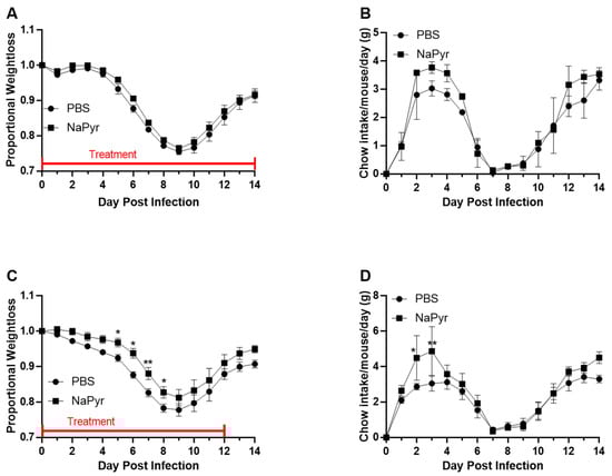 Our previous research with NaPyr in vitro established its immunomodulatory properties [31]. We, therefore, examined its effects in mice infected with IAV. WT C57BL/6J mice were infected with 250PFU of influenza A/PR/8/34 H1N1 virus and injected sub-cutaneously (Sub-Q) with 55 mg/kg of NaPyr twice a day for 14 days and compared to PBS injection controls. Although the injection of NaPyr resulted in increased food intake early and late during infection, it did not significantly improve weight loss in IAV infected mice (Figure 2A,B). Thus, we began looking for an alternative, more direct administration method during infection. Aerosols are used frequently for the treatment of lower respiratory infections, more specifically, viral pneumonia [35]. Hence, we hypothesized that a nebulization model would be a more direct route to the site of infection. Intriguingly, treating mice three times a day with nebulized 10 mM of NaPyr for approximately 15-min intervals, resulted in some improvement in weight loss and increase in food intake (Figure 2C,D). (Data in Figure 2C,D are combined from two independent experiments with n = 4–5 mice per treatment group per experiment. Two-way ANOVA p = 0.0399, 0.0043, 0.0116, and 0.0363 for days 5–8 in Figure 2C, Two-way ANOVA p = 0.0199 and 0.0093 for days 2–3 in Figure 2D).