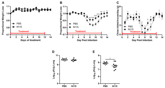As N115 improved weight loss, we next examined the cause for improved weight loss. We investigated viral titers by plaque assay on day 3, before weight loss, and day 7 p.i., just as the N115 treated mice started to show improvement in weight loss. We found that there was significantly less virus in the lungs of N115 treated mice compared to PBS treated controls on Day 7 (Figure 3D,E). (Viral titer data are combined from two individual experiments with 3–5 mice per treatment group per experiment. Statistical significance was determined using a Student’s t-test, p = 0.0172 for Figure 3E).