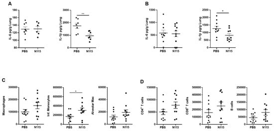 As previously reported in vitro [31], we also observed significantly less IL-1β levels in the lungs of N115 treated mice (Figure 4A,B). Despite lower IL-1β levels, most leukocyte numbers were similar in the lungs of N115 and PBS treated mice, except for inflammatory monocyte numbers, which were elevated in the N115 mice (Figure 4C,D). Overall, N115 appears to improve disease during IAV infection by decreasing virus titers and lowering inflammatory cytokine levels. (Data in Figure 4A–D are combined from two independent experiments with n = 3–5 mice per experiment. Statistical significance was determined using a Student’s t-test. Figure 4A p = 0.00672 for IL-1β; Figure 4B p = 0.0351 for IL-1β; Figure 4C p = 0.0442 for inflammatory monocytes).