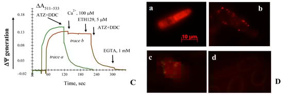 Effects of Ca2+, ATZ, and DDC on the ∆Ψ generated by the E. magnusii mitochondria respiring on a pyruvate + malate system. Additions and amounts are given in the figure by large arrows. Panel (A): Incubation medium contained 0.4 M mannitol, 0.1 M KCl, 20 mM Tris-acetate, 20 μM safranin, pH 7.4, and 0.4 mg of mitochondria protein. Trace a—control; trace b shows the effect of the addition of 500 μM Ca2+ on the ∆Ψ if the ions are taken up; trace c—the effect of a combined action of 4 mM ATZ and 4 mM DDC on the membrane potential. Small arrows indicate stirring for aeration. Panel (B): trace a shows 100 μM Ca2+ uptake. The medium was the same as that in Panel (A); instead of 20 μM safranin, 50 μM murexide was added; trace b shows 100 μM Ca2+ uptake in the same medium as that in trace a. The red arrow indicates the Ca2+ addition. Panel (C) incubation medium was the same as that in Panel (A). Trace a shows the effect of the addition of 4 mM DDC and 4 mM ATZ; trace b shows the effect of the addition of 100 μM Ca2+ followed by a combined action of 5 μM ETH129, 4 mM DDC, and 4 mM ATZ. Small arrows indicate the stirring for aeration. Panel (D): Micro-images of the potential-dependent stained’ mitochondria in the E. magnusii cells raised in the mid-exponential growth phase using Rh123. The regions of high mitochondrial polarization are bright red due to concentrated dye. a—control, magnification 100×; b, c—cells were pre-treated with both 4 mM ATZ and 4 mM DDC for 30 min, magnification 100×; c—the incubation medium contained 1 mM Ca2+; d—incubation medium contained 2 mM KCN. To examine the Rh123-stained preparations, filters of 02 and 15 (Zeiss) were used (magnification ×100). The photos were taken using an AxioCamMR camera. Figure 1A has been published in [37].