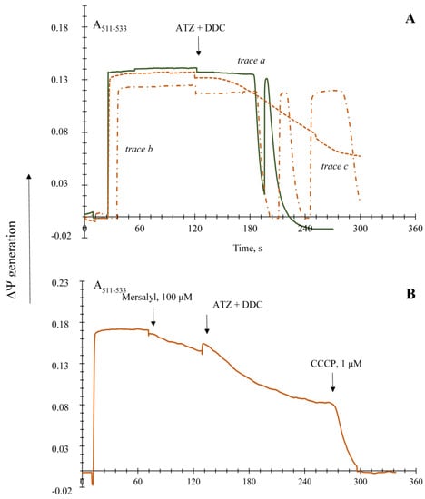 Recording of ∆Ψ generated by the E. magnusii mitochondria respiring on a 20 mM α-ketoglutarate (Panel (A)), 10 mM succinate (Panel (B)), 10 mM NADPH (Panel (C)), and 10 mM NADH (Panel (D)). The incubation medium contained 0.4 M mannitol, 0.1 M KCl, 20 mM Tris-acetate, 0.4 mg of mitochondria protein, and pH 7.4. Additions and amounts are indicated by large arrows. Trace a—control (solid line); trace b indicates the effect of the addition of 4 mM DDC, and of 4 mM ATZ (dashed line). The additions are indicated by arrows: the solid one for protonophore, 1 μM CCCP; the dashed one for ATZ and DDC. Small arrows indicate stirring for aeration.