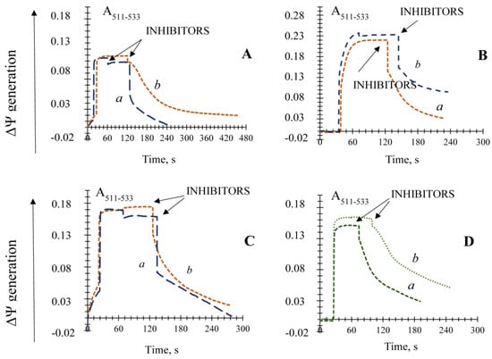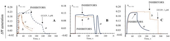 ∆Ψ was measured in isolated mitochondria (corresponding to 0.4 mg protein/mL) with 10–20 µM safranin as a probe with a Hitachi-557 dual-beam spectrophotometer [42]. It was performed using λ511 and λ533 nm as the measuring and reference wavelength, respectively. The incubation medium contained 0.4 M mannitol, 0.1 M KCl, 20 mM Tris-acetate, pH 7.4; 20 mM Tris-pyruvate, 5 mM malate, and mitochondria corresponding to 0.4 mg protein/mL. All data traces shown are representative of at least four to six analytical replicates.
