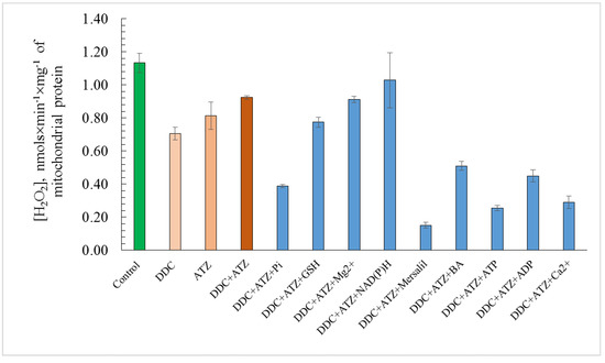 The obtained effects of various modulators of the nonspecific mitochondrial permeability were tested to affect the oxygen radicals level in the mitochondria. The ROS assay in the E. magnusii mitochondria showed a high generation of peroxide derivatives of AR in the control, reaching more than 1000 pmoles fluorescence units per 1 mg of mitochondrial protein (Figure 6). In this case, in the positive control, where 100 nmols/mL hydrogen peroxide was added, the ROS level increased six-fold compared to that in the control mitochondria. The antioxidant systems inhibitors DDC and ATZ, added both separately and together, led to a decrease in the peroxide generation level in the mitochondria by about 20–30% compared to that in the control (without any other additives) (Figure 6). The effect of the non-specific permeability modulators could be divided into two groups: (1) the ones that affected no ROS level (Mg2+ ions, NAD(P)H), or did so insignificantly (GSH) in the background of the application of the antioxidant enzyme inhibitors (ATZ+DDC); (2) the modulators with a powerful antioxidant effect (Pi, mersalyl, BA, ADP, ATP, Ca2+ ions) (Figure 6). Mersalyl, ATP, and Ca2+, which authentically reduced the rate of ROS generation by 83%, 73%, and 69%, respectively, were the most impactful compared to the ATZ + DDC variants (Figure 6).