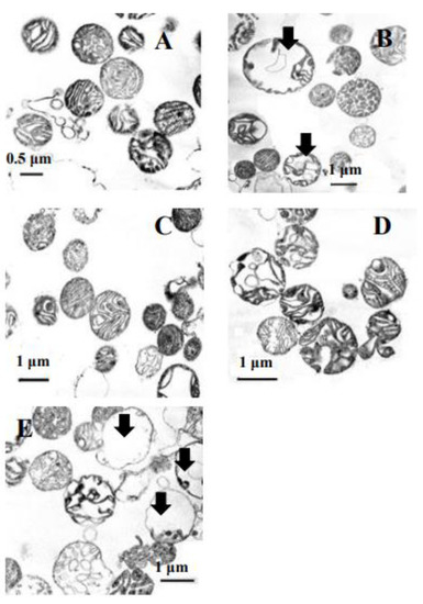 Micro-images of transmission electron microscopy of the E. magnusii mitochondria. (A) —control, (B)—after a 3-min incubation with the antioxidant enzyme inhibitors of 4 mM ATZ and 4 mM DDC; (C)—after a 1-min incubation with 5 mM Mg2+ and 5 mM Pi followed by a 3-min treatment with the antioxidant enzyme inhibitors of 4 mM ATZ and 4 mM DDC; (D)—after a 1-min incubation with10 mM NADH followed by a 3-min treatment with the antioxidant enzyme inhibitors of 4 mM ATZ and 4 mM DDC; (E)—after a 1-minute incubation with 5 mM GSH followed by a 3-min treatment with the antioxidant enzyme inhibitors of 4 mM ATZ and 4 mM DDC.