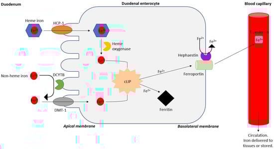 Iron is absorbed in the duodenum and proximal jejunum. Heme and non-heme iron have different mechanisms of absorption (Figure 1). For heme iron, heme carrier protein 1 (HCP-1) transports iron into the enterocyte lumen, where the ferrous (Fe2+) iron is released from the protoporphyrin XI ring by heme oxygenase [19]. Non-heme iron is first converted from ferric (Fe3+) to Fe2+ iron by the reductase enzyme duodenal cytochrome B (DCYTB). Then divalent metal transporter-1 (DMT-1) on the apical surface of duodenal enterocytes actively transports the reduced iron into the enterocyte cytoplasm [19]. Iron is regulated at the level of intestinal absorption to prevent iron overload as there is a lack of an iron excretory pathway. Hepcidin is the main regulator for the accumulation of iron in the body. When iron stores and circulating iron in transferrin are at saturation point, liver hepatocytes produce hepcidin. This triggers the degradation of ferroportin, a transmembrane protein involved in iron efflux, preventing further iron absorption [20].
