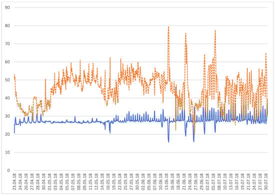 Temperature (°C, continuous line) and relative humidity (%, dashed line) of the rearing room.