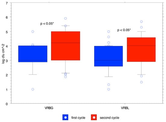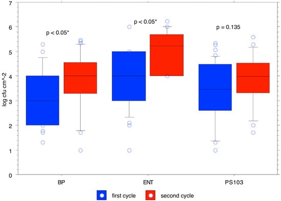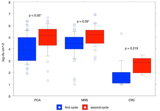The trend over time of the means calculated for the different bacterial populations (expressed as log cfu/cm2) in the rearing boxes is shown in Table 2. The total aerobic mesophilic count was 4.44 ± 1.14 cfu/cm2 at t0 and reached 5.38 ± 0.28 cfu/cm2 at t63, with its maximum at t49 with a concentration of 5.61 ± 1.06 cfu/cm2. Pseudomonas spp. count was 3.63 ± 1.44 cfu/cm2 at t0 and reached 3.71 ± 0.89 cfu/cm2 at t63, with its maximum at t49 with a concentration of 4.92 ± 0.45 cfu/cm2. The Enterobacteriaceae count was 3.49 ± 0.64 cfu/cm2 at t0 and reached 4.68 ± 0.33 cfu/cm2 at t63, with its maximum at t49 with a concentration of 5.32 ± 0.55 cfu/cm2. The total coliforms count was 3.56 ± 0.66 cfu/cm2 at t0 and reached 4.38 ± 0.81 cfu/cm2 at t63, with its maximum at t49 with a concentration of 4.66 ± 0.51 cfu/cm2. The enterococci count was 4.28 ± 0.82 cfu/cm2 at t0 and reached 4.60 ± 0.68 cfu/cm2 at t56, with its maximum at t28 with a concentration of 5.49 ± 0.34 cfu/cm2. Lactobacillus spp. count was 4.70 ± 0.97 cfu/cm2 at t0 and reached 5.08 ± 0.53 cfu/cm2 at t63, with its maximum at t49 with a concentration of 5.86 ± 1.12 cfu/cm2. Staphylococcus spp. count was 3.74 ± 0.99 cfu/cm2 at t0 and reached 4.77 ± 0.46 cfu/cm2 at t63, which was also its maximum concentration. The mold count was 2.06 ± 1.24 cfu/cm2 at t0 and reached 3.14 ± 0.32 cfu/cm2 at t63, which was also its maximum concentration. p-values for total aerobic mesophilic microbiota, lactobacilli, Enterobacteriaceae, total coliforms, staphylococci, and enterococci showed that counts were significantly higher in the second cycle (Figure 2, Figure 3 and Figure 4).