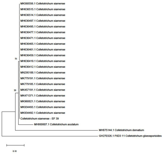 Colony growth of the endophyte grown in V8JA medium was uniform and circular, with a white color (both plate sides). The fungus had a felty texture, medium density at the center while sparse at the margin and was without zonation (Figure 2). Three days after incubation at room temperature, growth diameter measured 54.0 mm (n = 5). The conidia were unicellular or one-celled, hyaline and with fusiform shape. Conidial size ranged from 10.4 to 17.9 (L) × 2.6 to 5.5 µm (W) with a mean of 13.0 ± 1.1 (SD) × 3.6 ± 0.6 µm (n = 50). The color of the appressoria was light brown to brown with sizes ranging from 6.9 to 13.9 (L) × 5.2 to 8.8 µm (W) with a mean of 9.6 ± 1.3 × 6.3 ± 0.8 µm (n = 15). The endophyte did not produce setae in all the slide cultures examined. Based on the sequence of ITS regions, the endophyte exactly matched C. siamense with 100% sequence similarity. A total of 64 accessions deposited in the GenBank nucleotide database of C. siamense was found, similar to the Colletotrichum sp. Corda EF 39 amplified sequence (Supplementary Materials Table S1) from asymptomatic cacao leaves. The phylogenetic tree showed that the endophyte sequence grouped with those of C. siamense deposited in GenBank (Figure 3).On the other hand, the endophyte was distant from other species of Colletotrichum as reference isolates, such as C. acutatum, C. dematium and C. gloeosporioides.